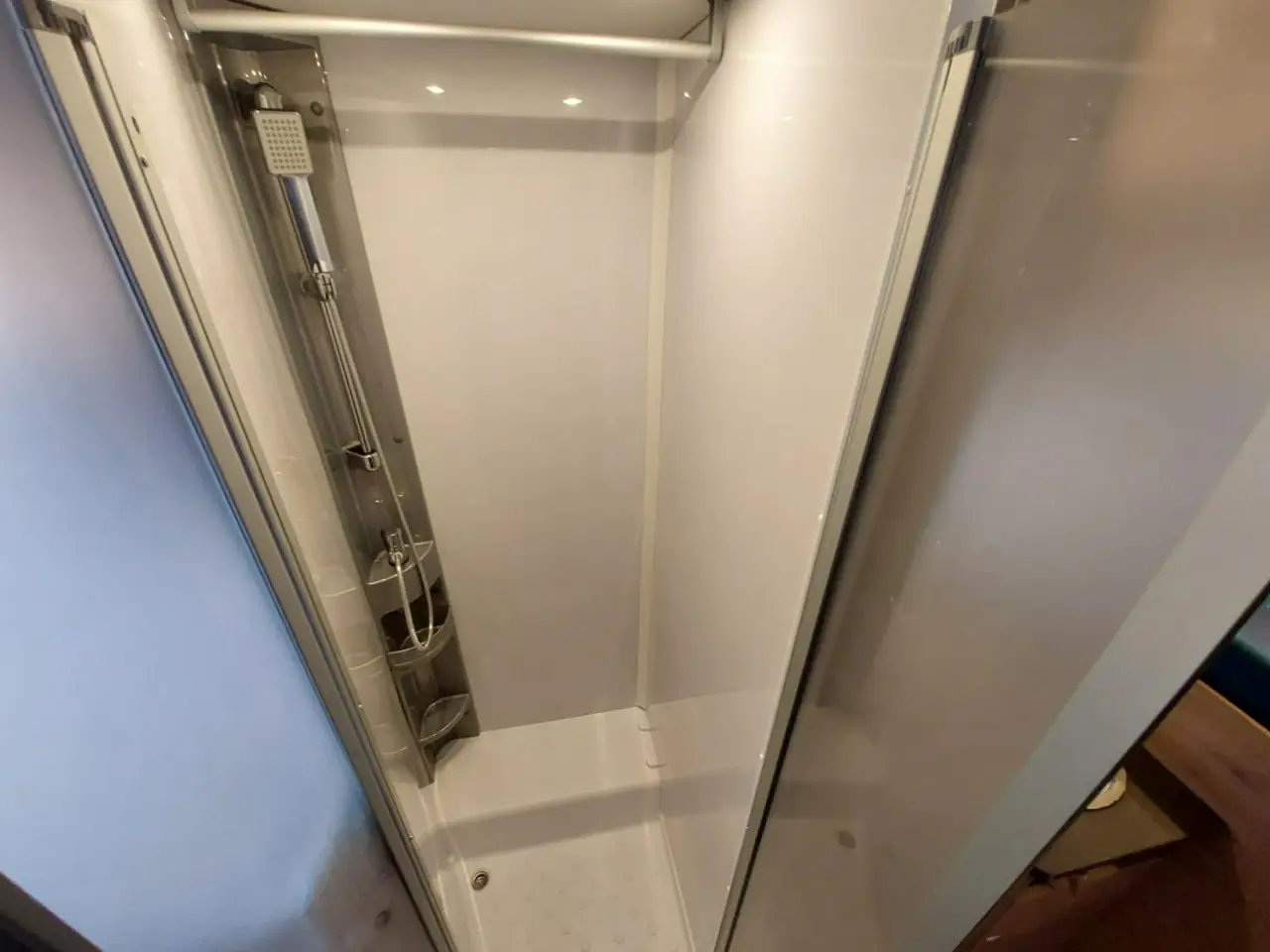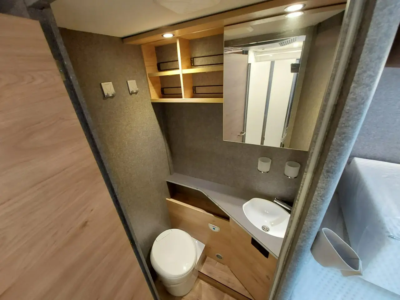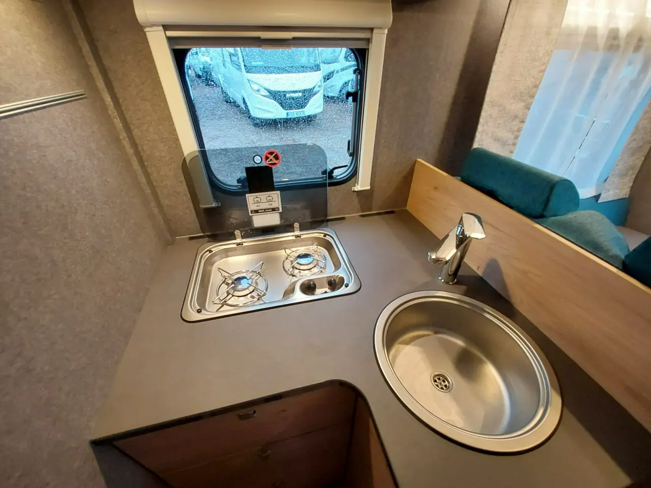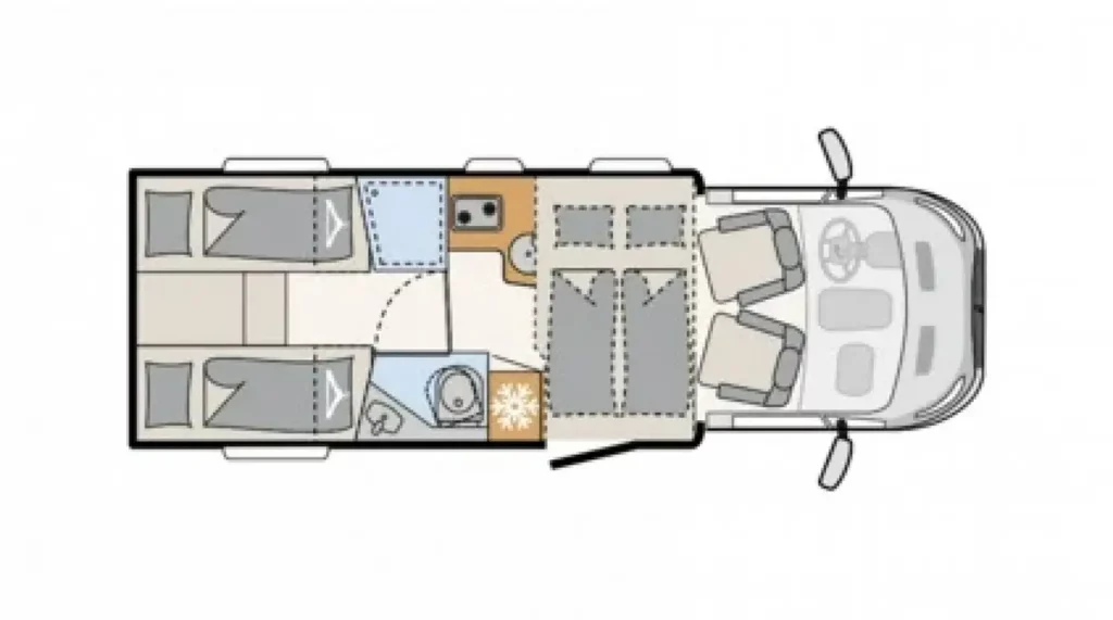 Nasz kamper 4-osobowy ma też osobną toaletę i prysznic, co pozwala korzystać z tych pomieszczeń dwóm osobom jednocześnie i przyspieszyć poranną czy wieczorną higienę. Kuchnia zaś, mimo kompaktowych rozmiarów, pozwala w wygodny sposób przygotować każdy posiłek na gazowej kuchence.
