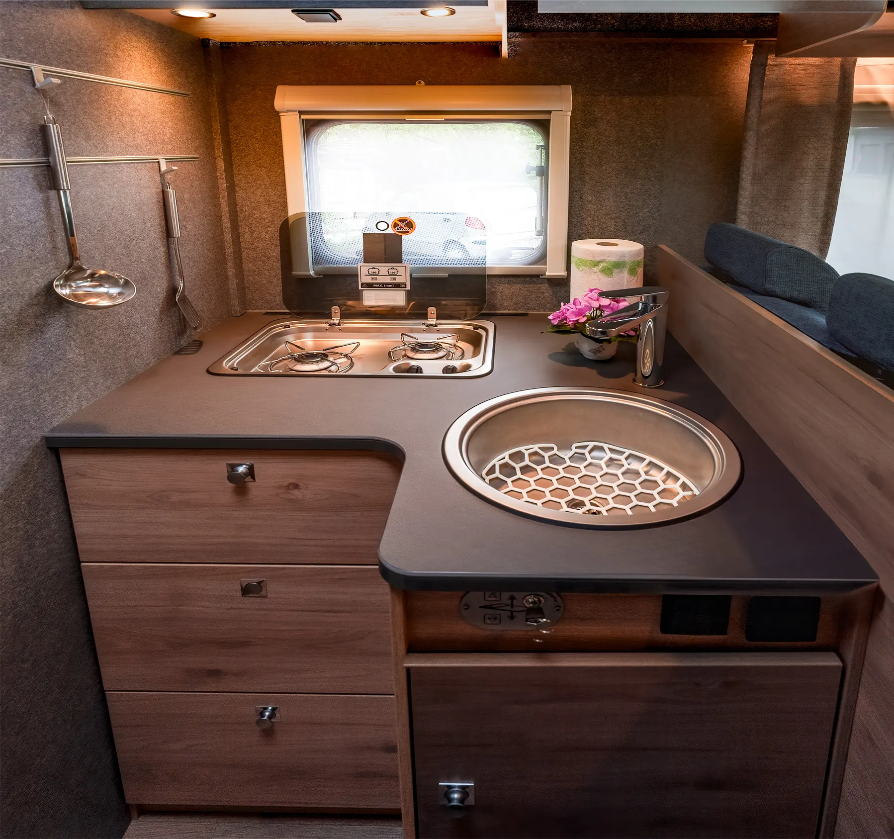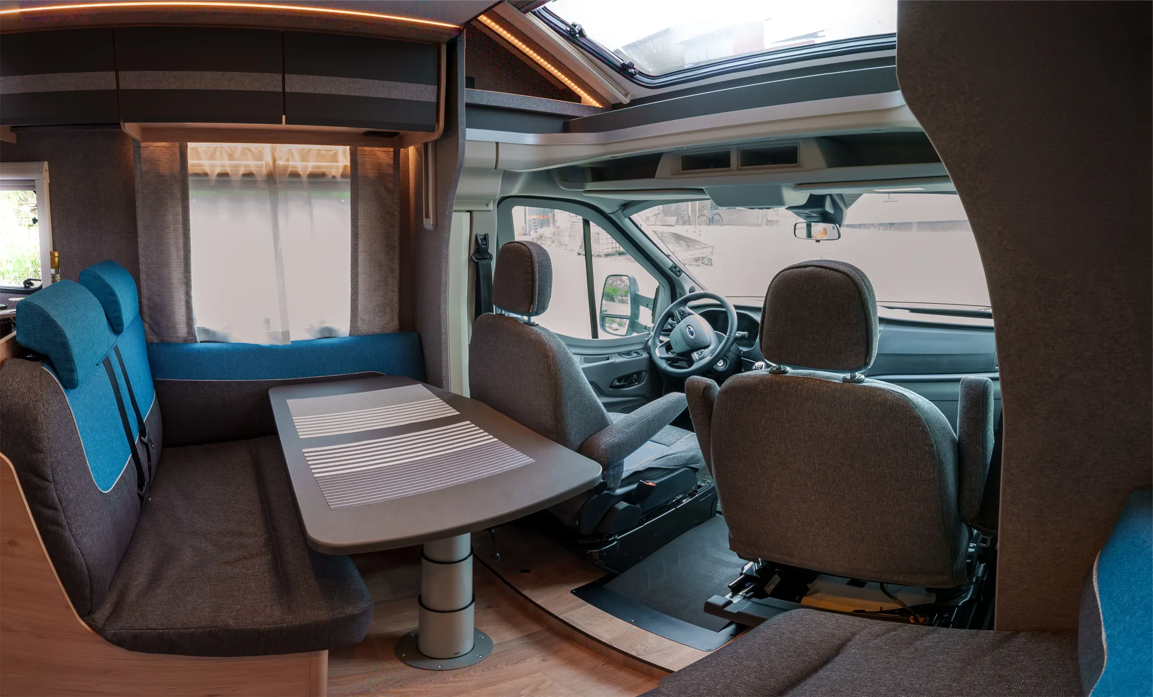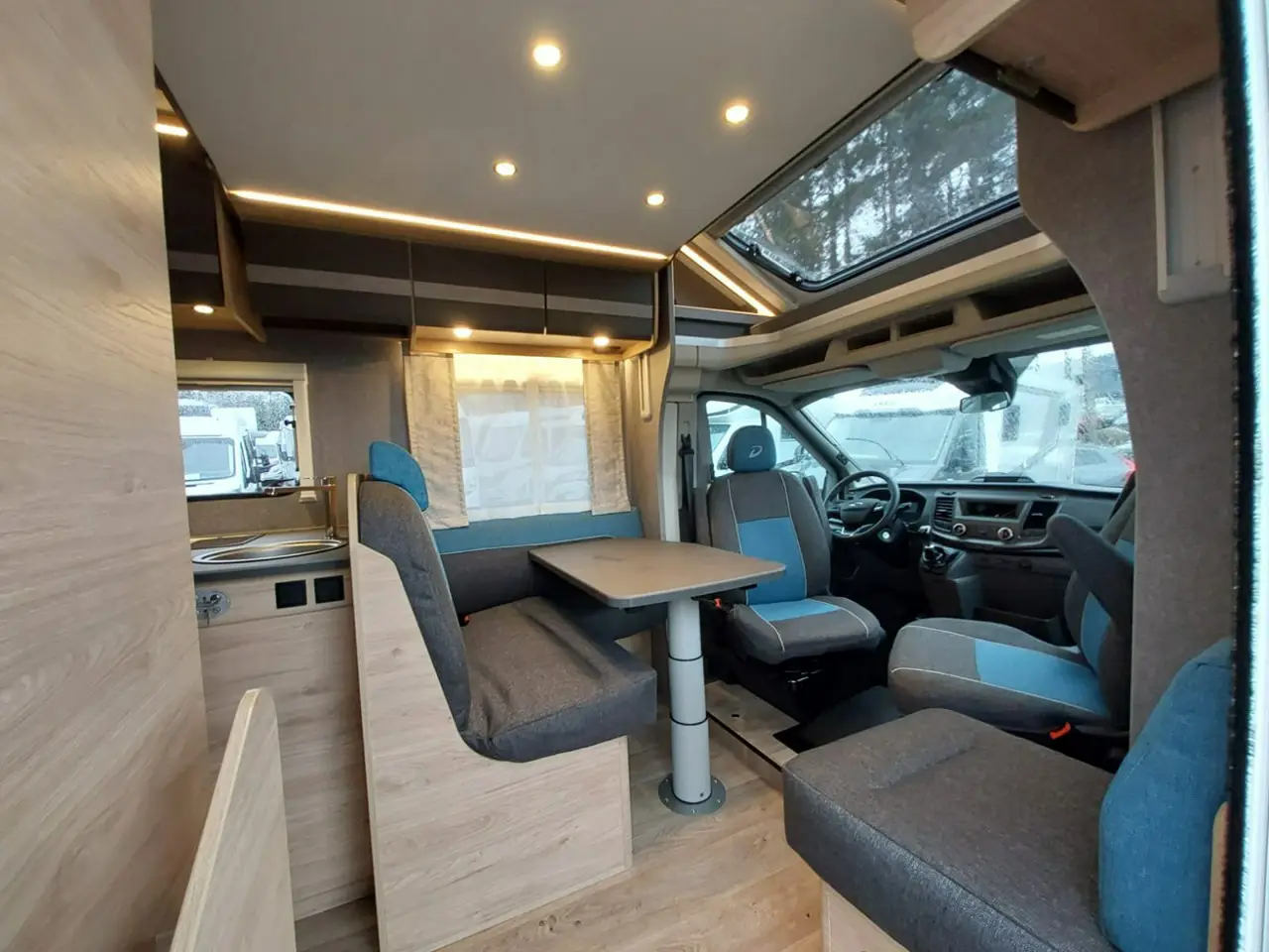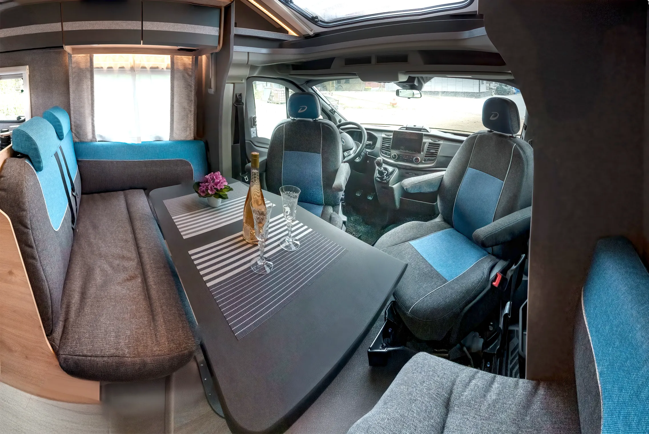 Niewątpliwą zaletą jest również wyposażenie w rolety we wszystkich oknach, co pozwala na pełne wyciemnienie pojazdu na czas snu. Dzięki temu niezależnie od tego, gdzie zaparkujesz, możesz liczyć na komfortowe warunki do wypoczynku. W części jadalnianej we wnętrzu auta zmieści się nawet 6 osób, więc możesz zaprosić kogoś na wspólny posiłek. Ponadto siedziska są naprawdę wygodne, a okno dachowe typu panorama umożliwia cieszenie się widokiem spadających gwiazd z wnętrza samochodu kempingowego.