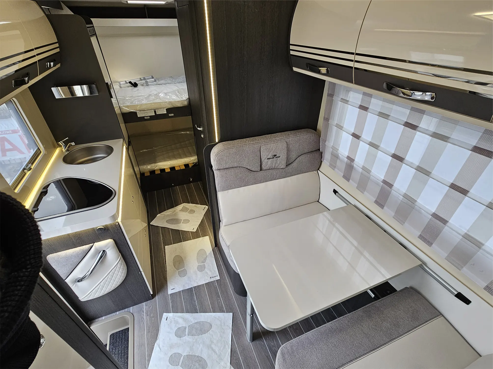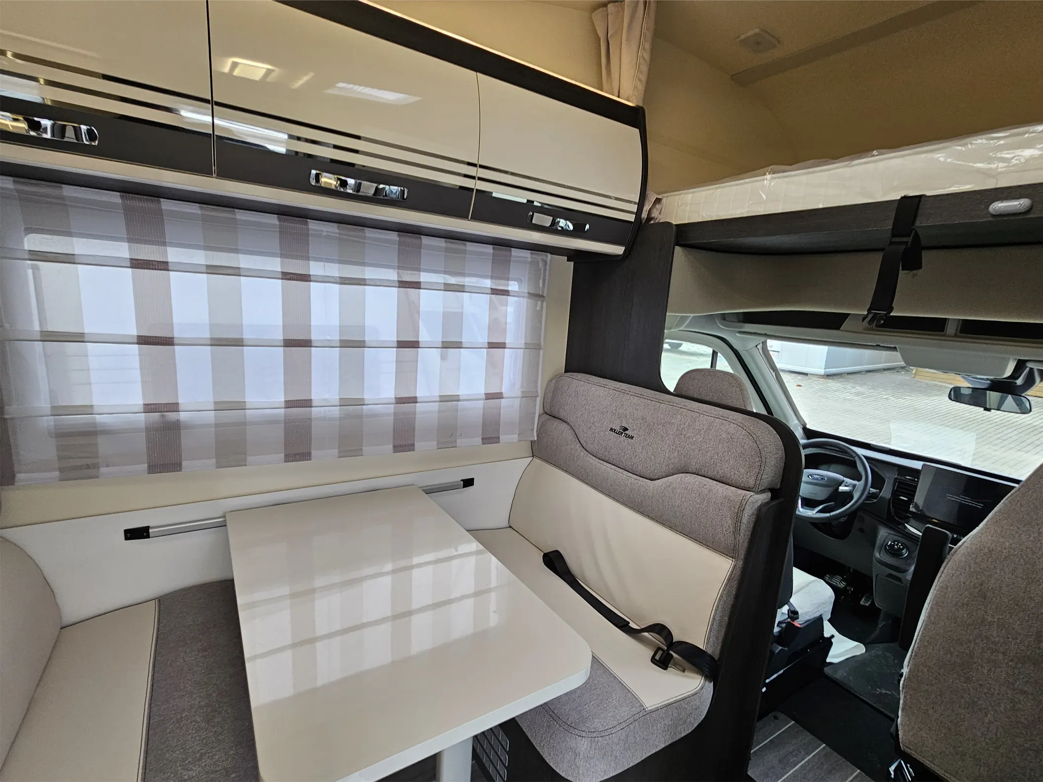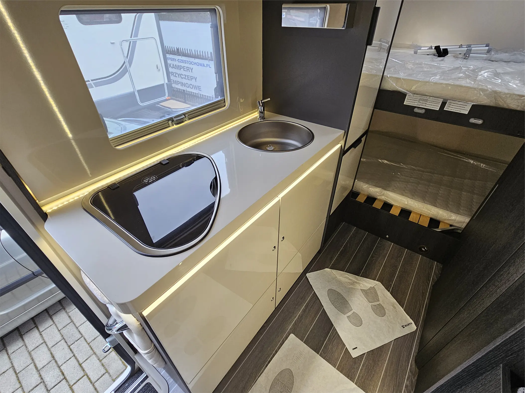 Niewątpliwą zaletą jest również wyposażenie w rolety we wszystkich oknach, co pozwala na pełne wyciemnienie pojazdu na czas snu. Dzięki temu niezależnie od tego, gdzie zaparkujesz, możesz liczyć na komfortowe warunki do wypoczynku. W części jadalnianej we wnętrzu auta zmieści się nawet 6 osób, więc możesz zaprosić kogoś na wspólny posiłek. Ponadto siedziska są naprawdę wygodne, a okno dachowe typu panorama umożliwia cieszenie się widokiem spadających gwiazd z wnętrza samochodu kempingowego.