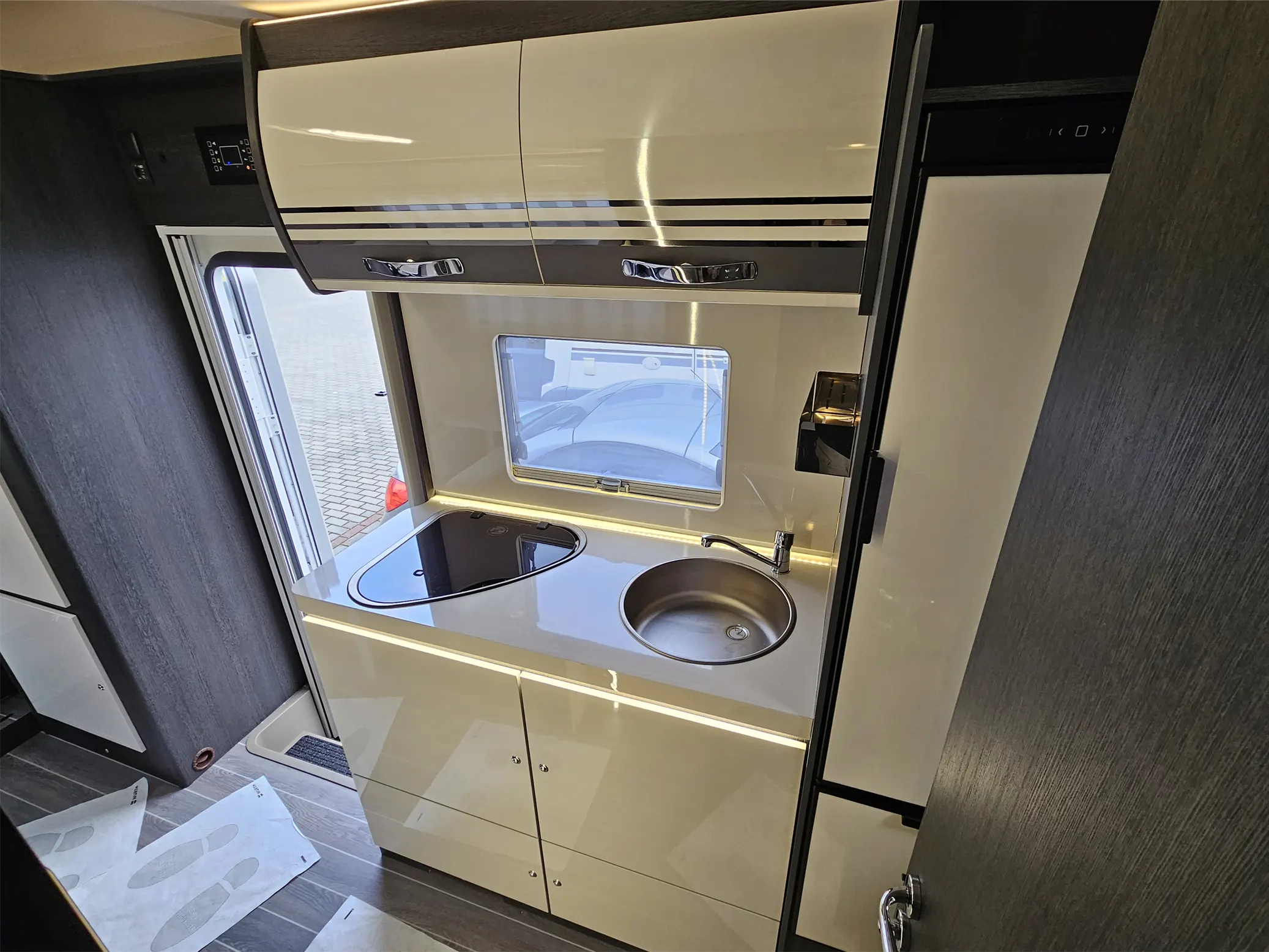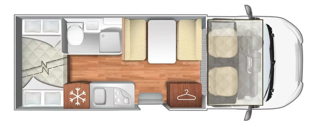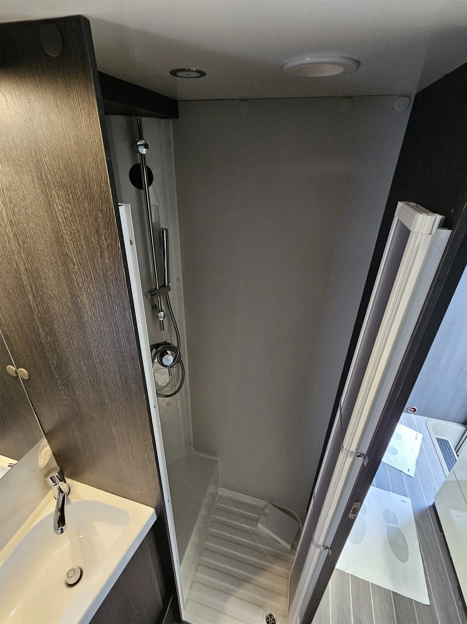 Nasz kamper 6-osobowy ma też osobną toaletę i prysznic, co pozwala korzystać z tych pomieszczeń dwóm osobom jednocześnie i przyspieszyć poranną czy wieczorną higienę. Kuchnia zaś, mimo kompaktowych rozmiarów, pozwala w wygodny sposób przygotować każdy posiłek na gazowej kuchence.