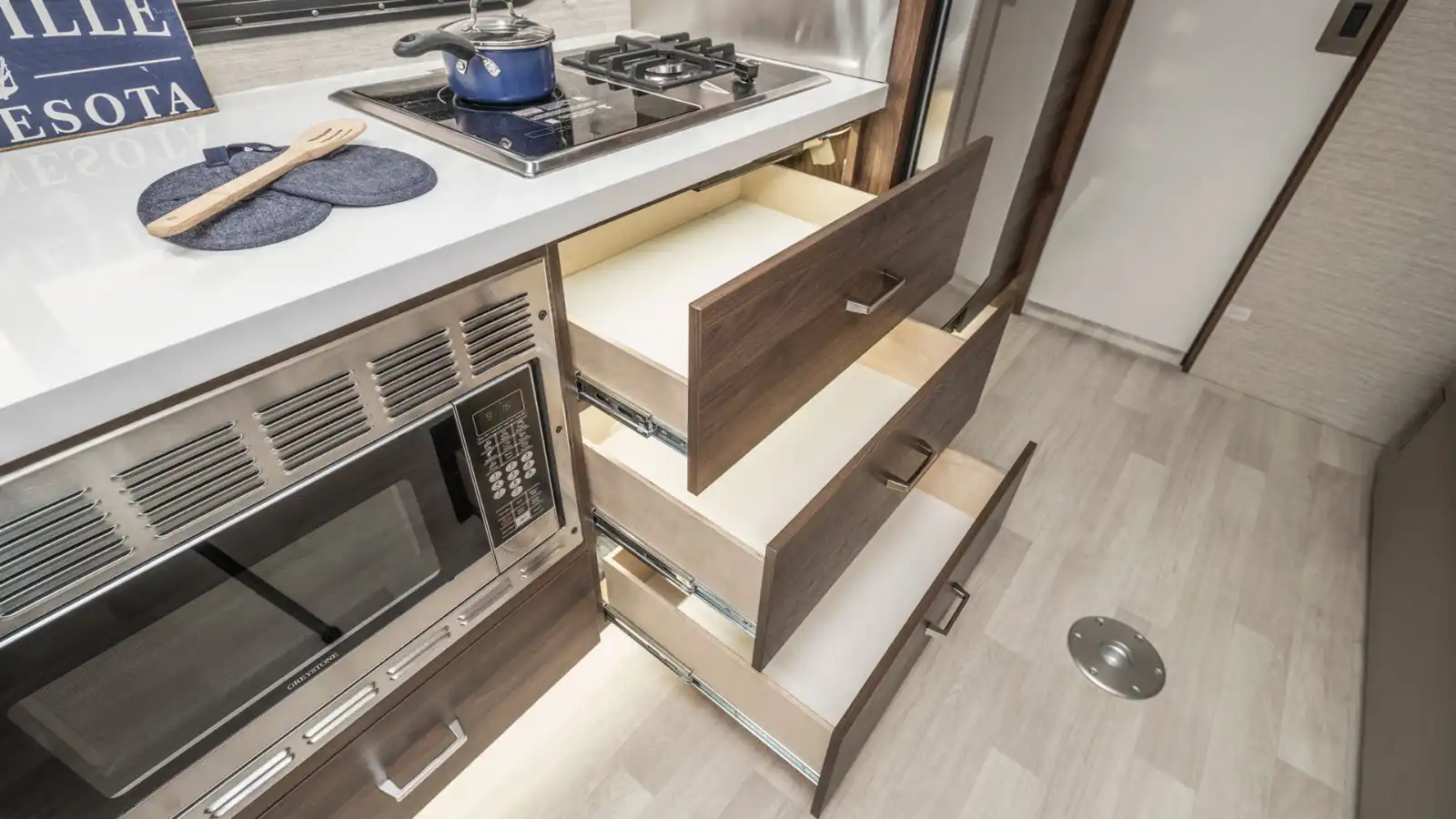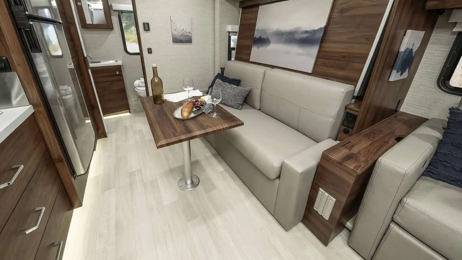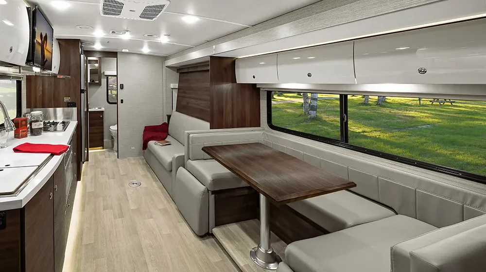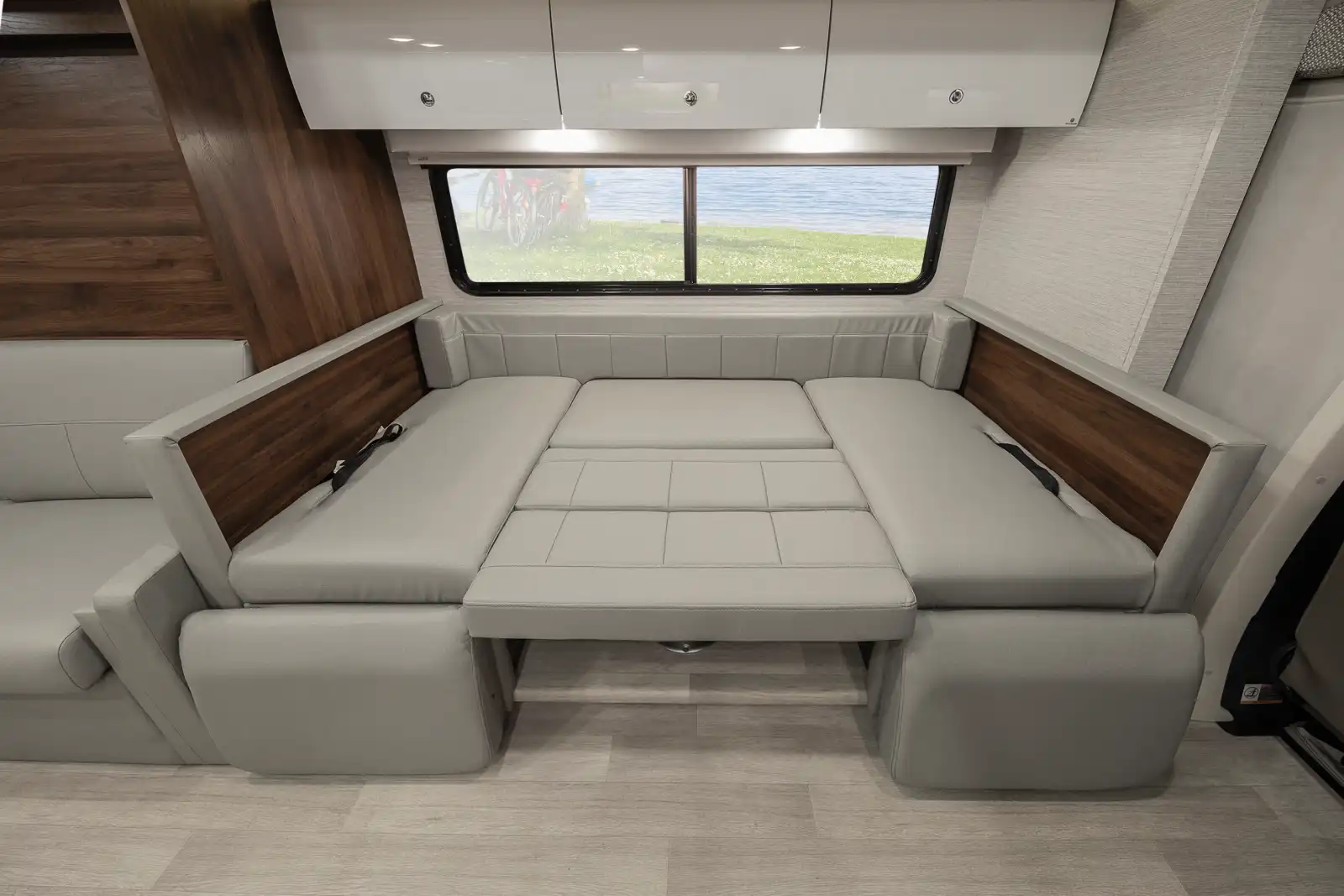 Kuchnia i łazienka to ważne miejsca w domu na kółkach, z którego będziesz korzystał w czasie swoich podróży. Jeśli zdecydujesz się na kamper 6-osobowy, wynajem za pośrednictwem naszej firmy to gwarancja wyposażenia w postaci kuchenki gazowej i indukcyjnej, zlewozmywaka oraz lodówki i zamrażalnika. Nie musisz też zabierać ze sobą garnków czy talerzy, bo wszystko znajdziesz w szafkach i szufladach w aucie Winnebago View. Do dyspozycji masz również komfortową część jadalnianą z dwoma stolikami.