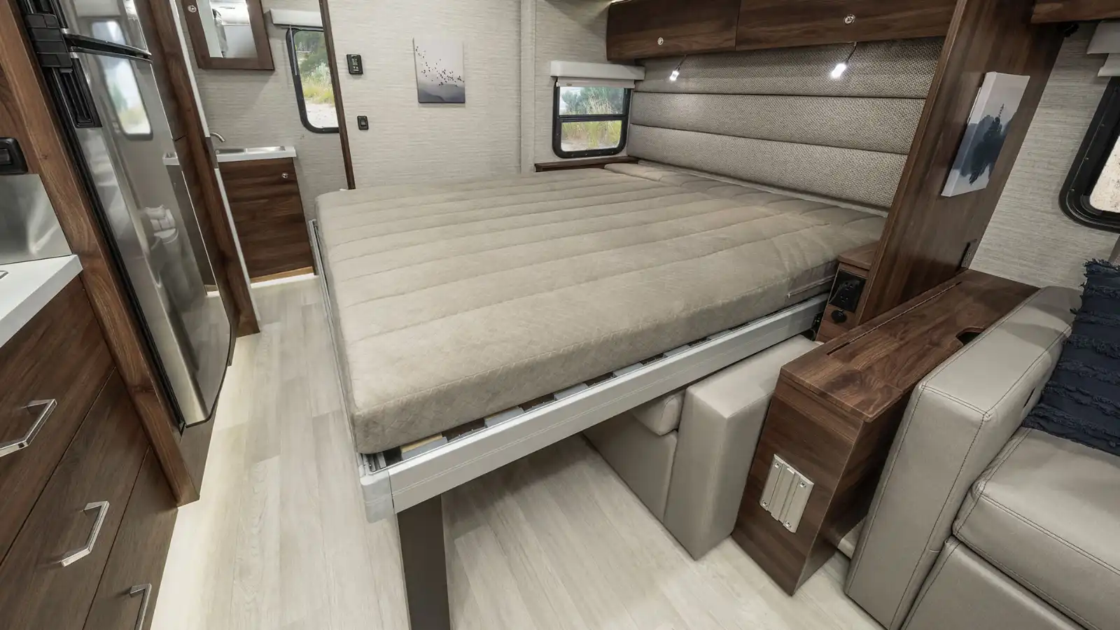 • tylne łóżko 220cm x 200cm rozkładane ze śćiany zasłaniane kotarą